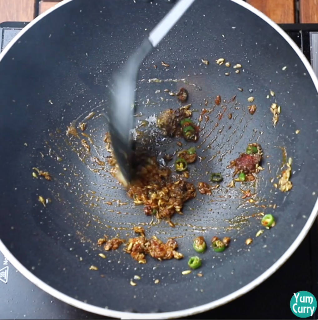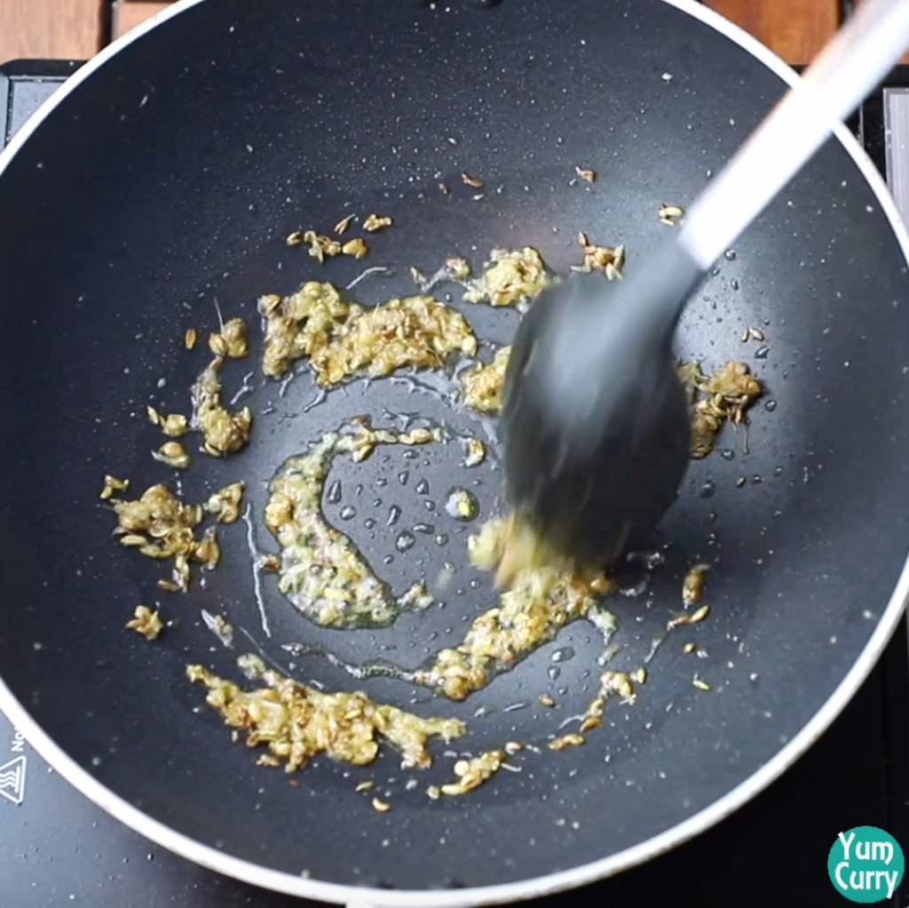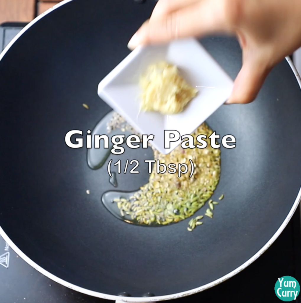 • Add cumin seeds, fennel seeds, asafoetida, coriander seeds and ginger paste to it. Saute for a while on low-medium heat.