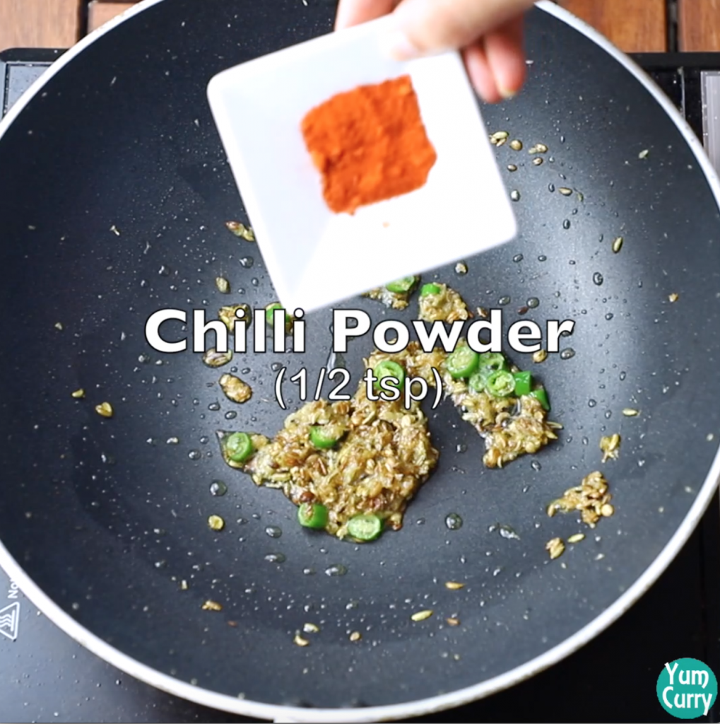 • Add green chilli and mix. Now add all the spices. Red chilli powder, dry mango powder and garam masala to it. Mix well.