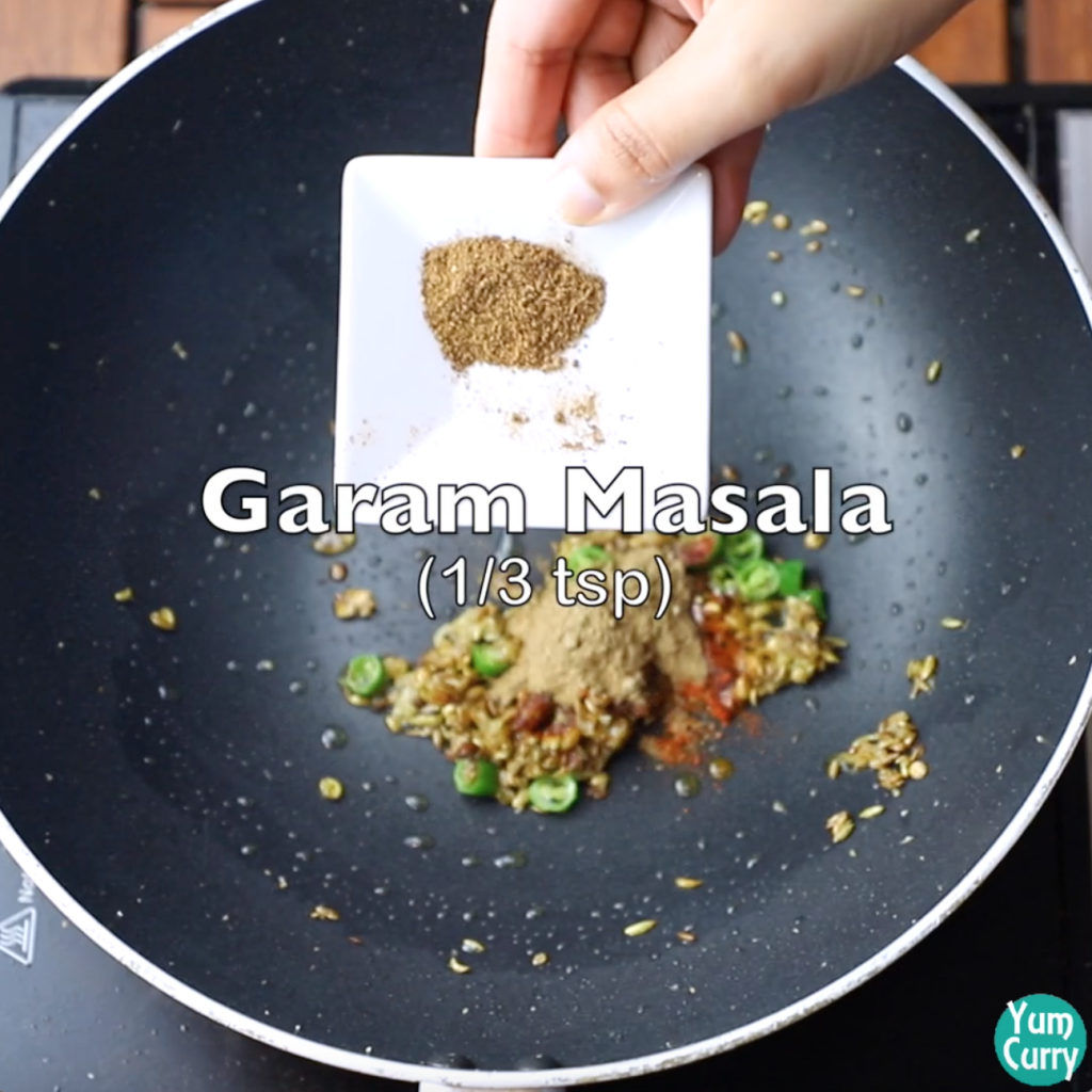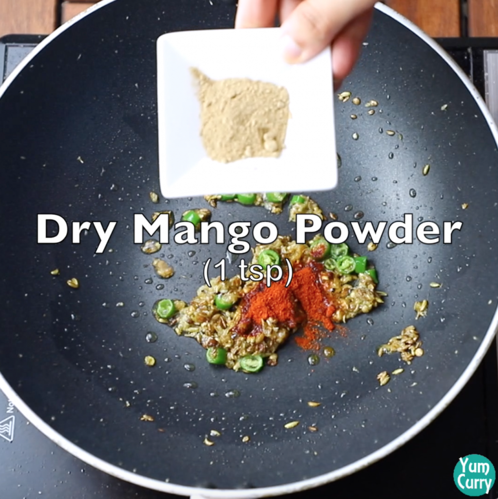 3. Add green chilli and mix. Now add all the spices. Red chilli powder, dry mango powder and garam masala to it. Mix well.