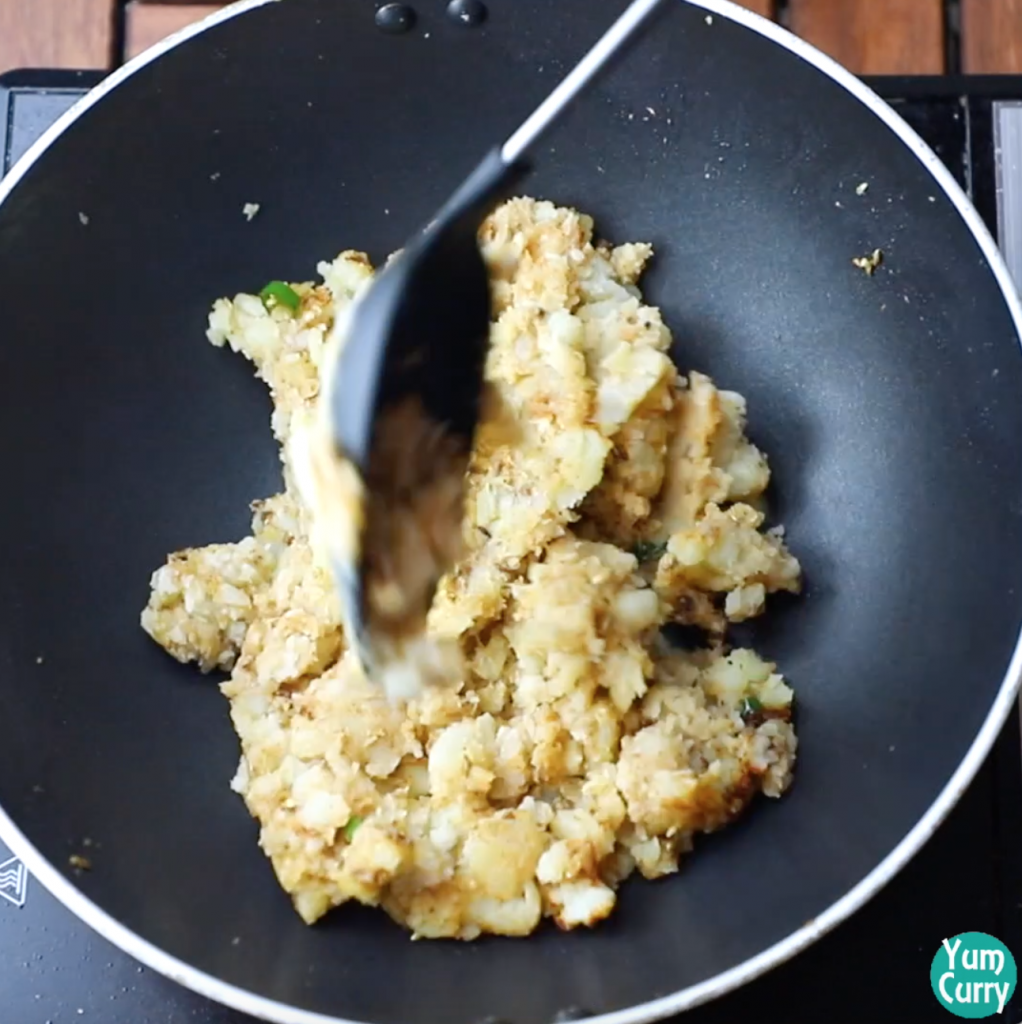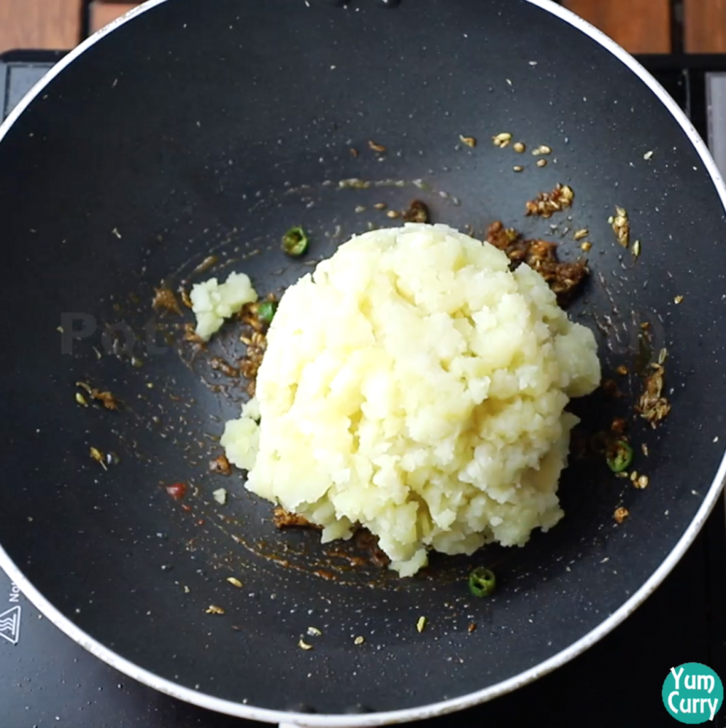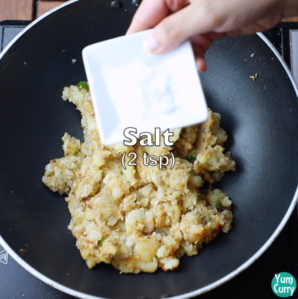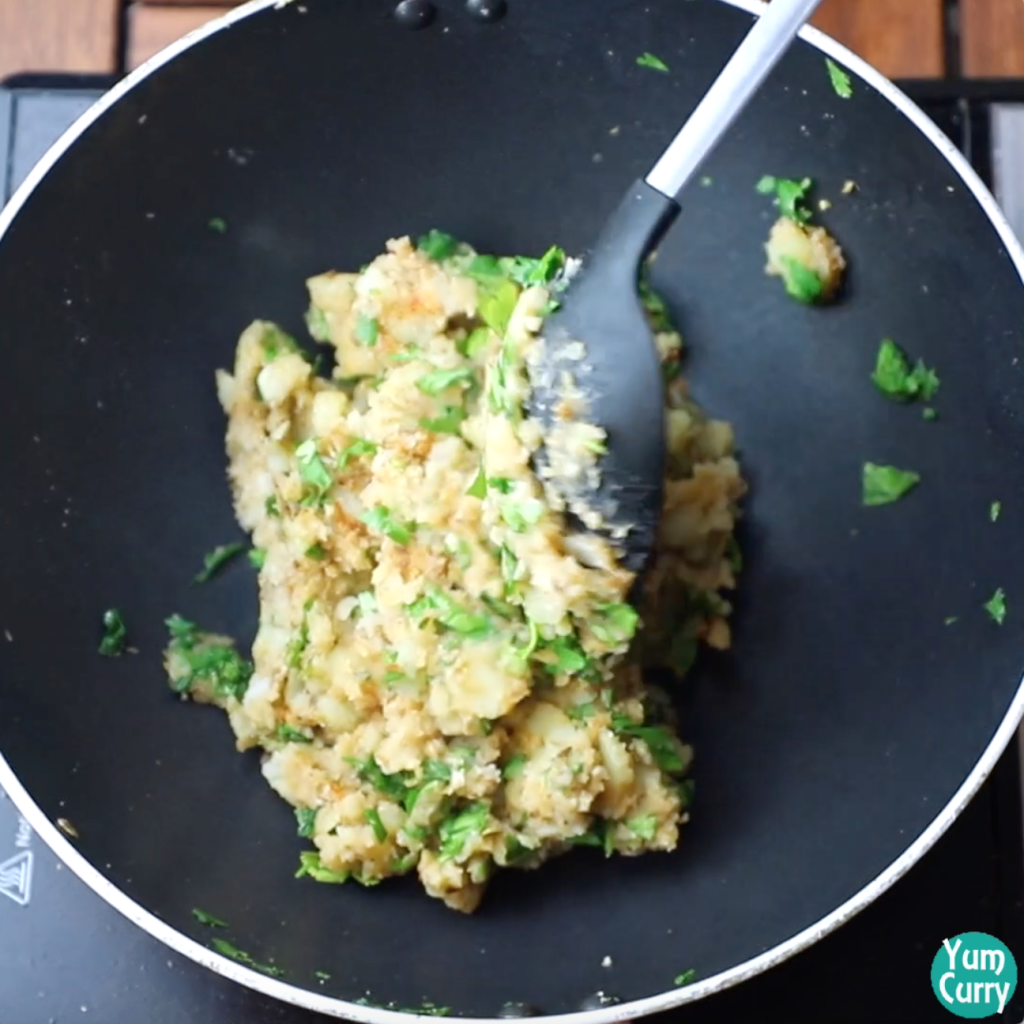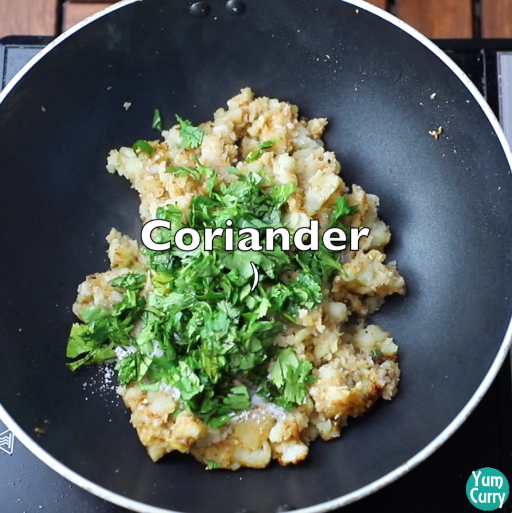 • Now add salt and fresh coriander to it. Mix well. The filling is ready. Transfer to a bowl and let it cool.