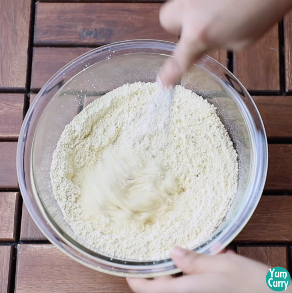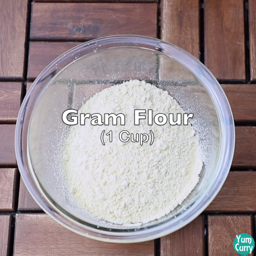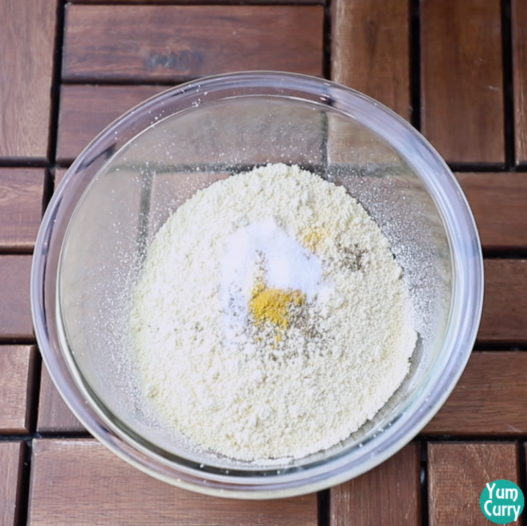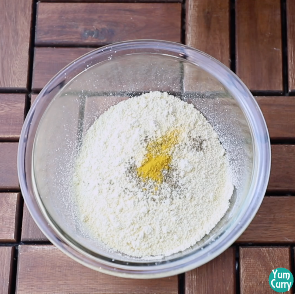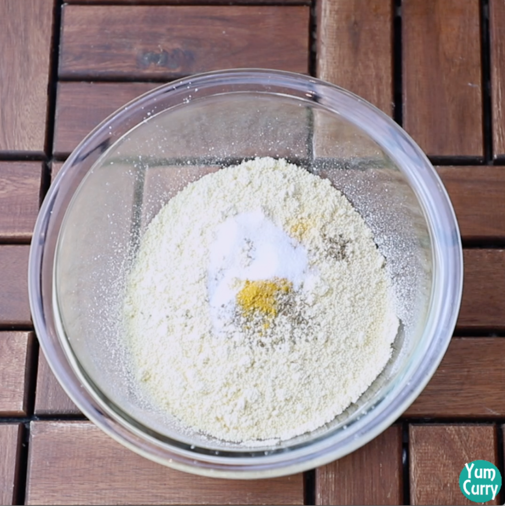 • Take gram flour/besan in a bowl. Add carom seeds, salt, turmeric and baking soda to it. Mix well.