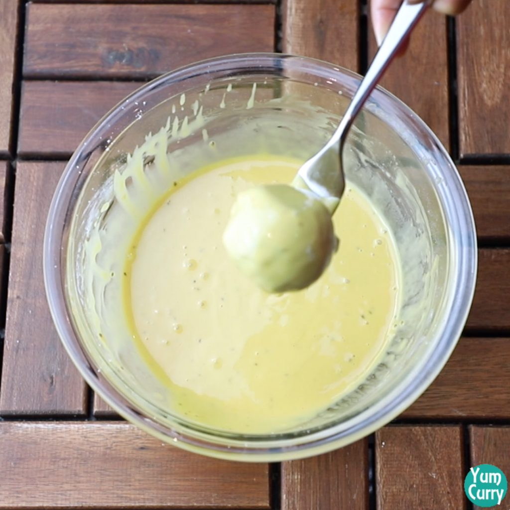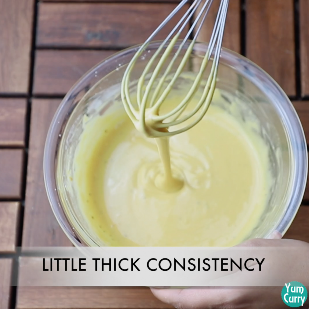 • Now start adding water, small portions at a time and keep mixing. Prepare a little thick batter.