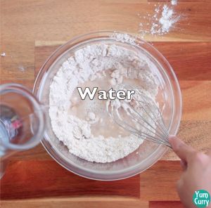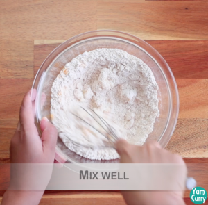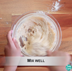 - Take a bowl and add wheat flour, salt, turmeric and curd and mix well