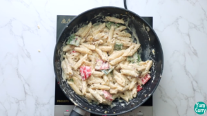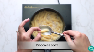 • Add penne pasta to the boiling water and let the pasta boil on medium heat. Let the pasta boil until it is done al dente, that is it becomes soft yet still firm.