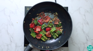 • Add red bell pepper and capsicum and fry on medium heat for 2 to 3 minutes.