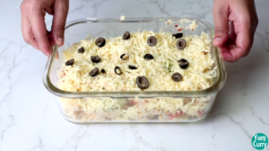 1. Grate 1/2 cup mozzarella cheese and spread it on top of the pasta. Also, add some chopped olives on top.baked pasta
