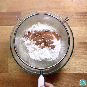 • Now add the sifted all purpose flour/maida, baking powder, baking soda and cinnamon powder to it. Mix it well.
