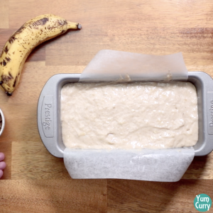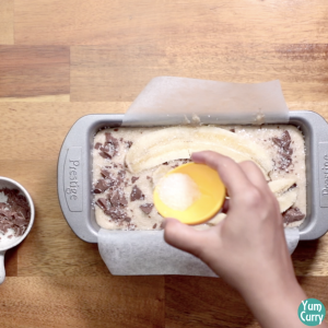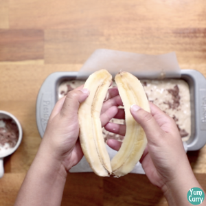 10. Now take a banana, peel it and slice it in half. Place it on the top. Press it a little.banana-bread-recipe