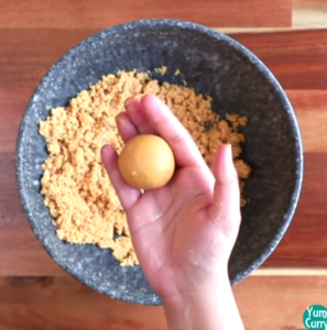 11. Once you mix everything, grease your palms with ghee and take a small portion in your hands.