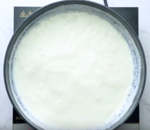 4. While it is condensing, you will notice that the amount of milk is reduced to 1/3rd of the original amount in the pan.
