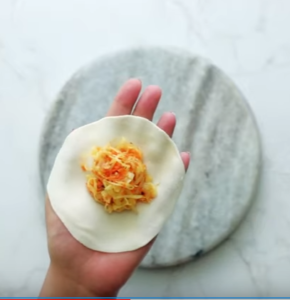 - Take each sheet and place the vegetable filling in a certain amount while folding the momos so that, it won’t come out while folding the sheets.