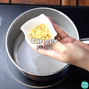 - Take grated ginger or ginger paste and use a spoon to squeeze out the juice. Add this juice to the pan.