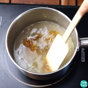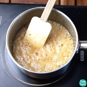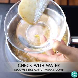 - To check whether it’s done or not, take water in a bowl and drop some syrup in it. If it becomes like candy means it is done. Turn off the heat.