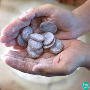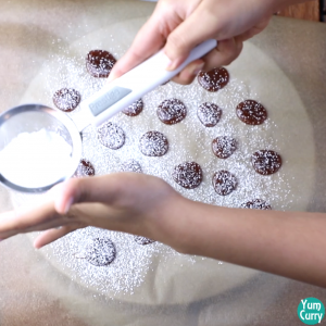 - Sprinkle some powdered sugar using a strainer on the candies (This is to prevent candies from sticking together). Take off the candies from the parchment paper and cover it from all the sides with powdered sugar.