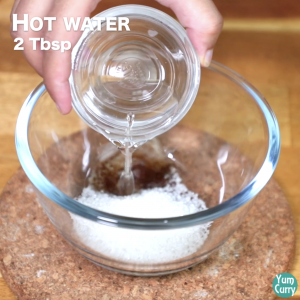 - Take a bowl and add instant coffee powder, sugar and hot water to it.