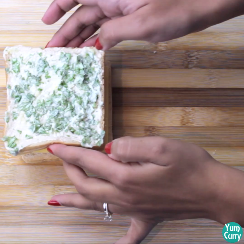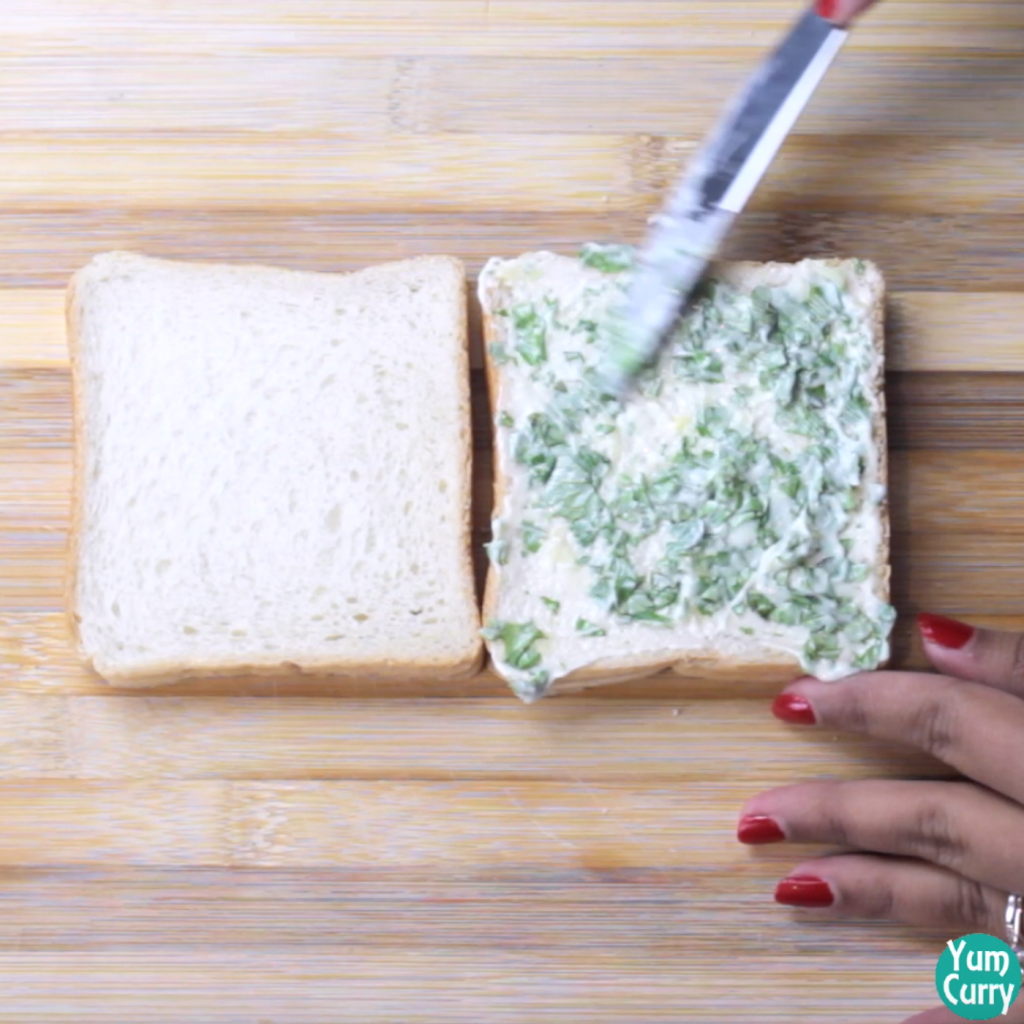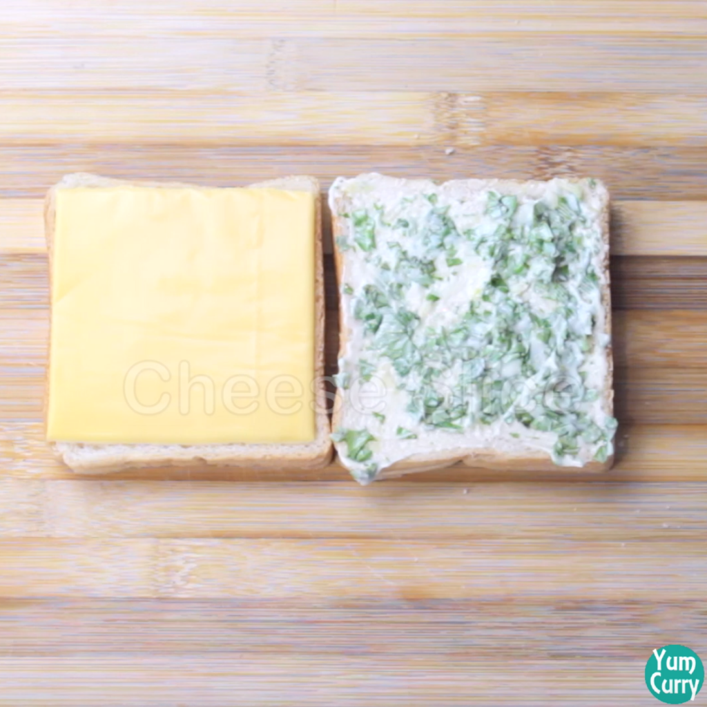 • Apply this mixture generously on one side of the bread. Add cheese slice on the other bread.
