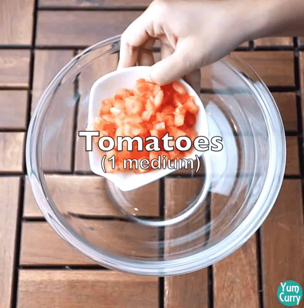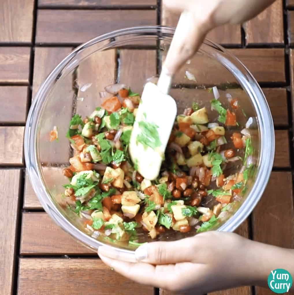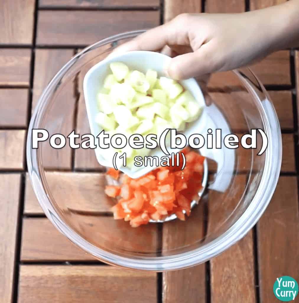 - In a mixing bowl add tomato cut in small pieces and add boiled potato pieces.