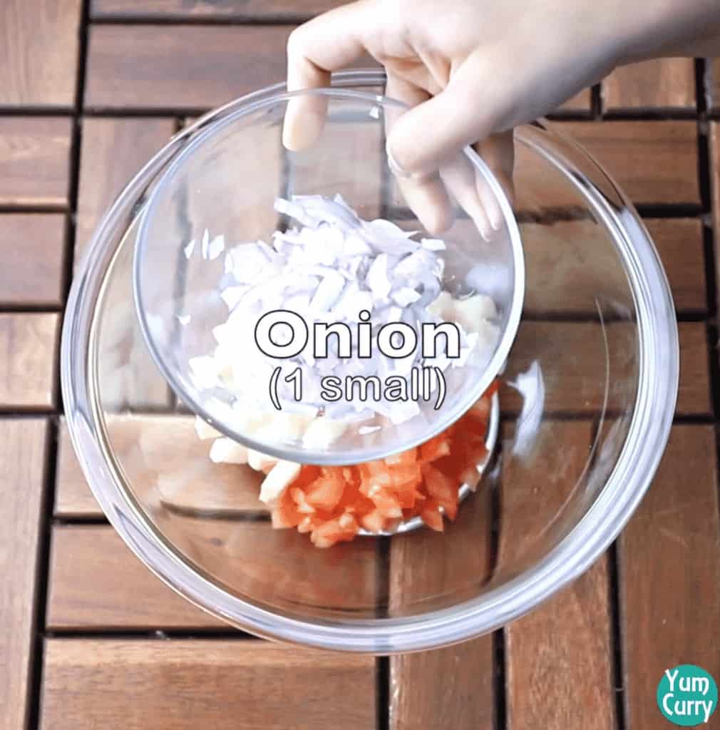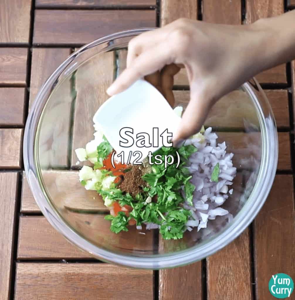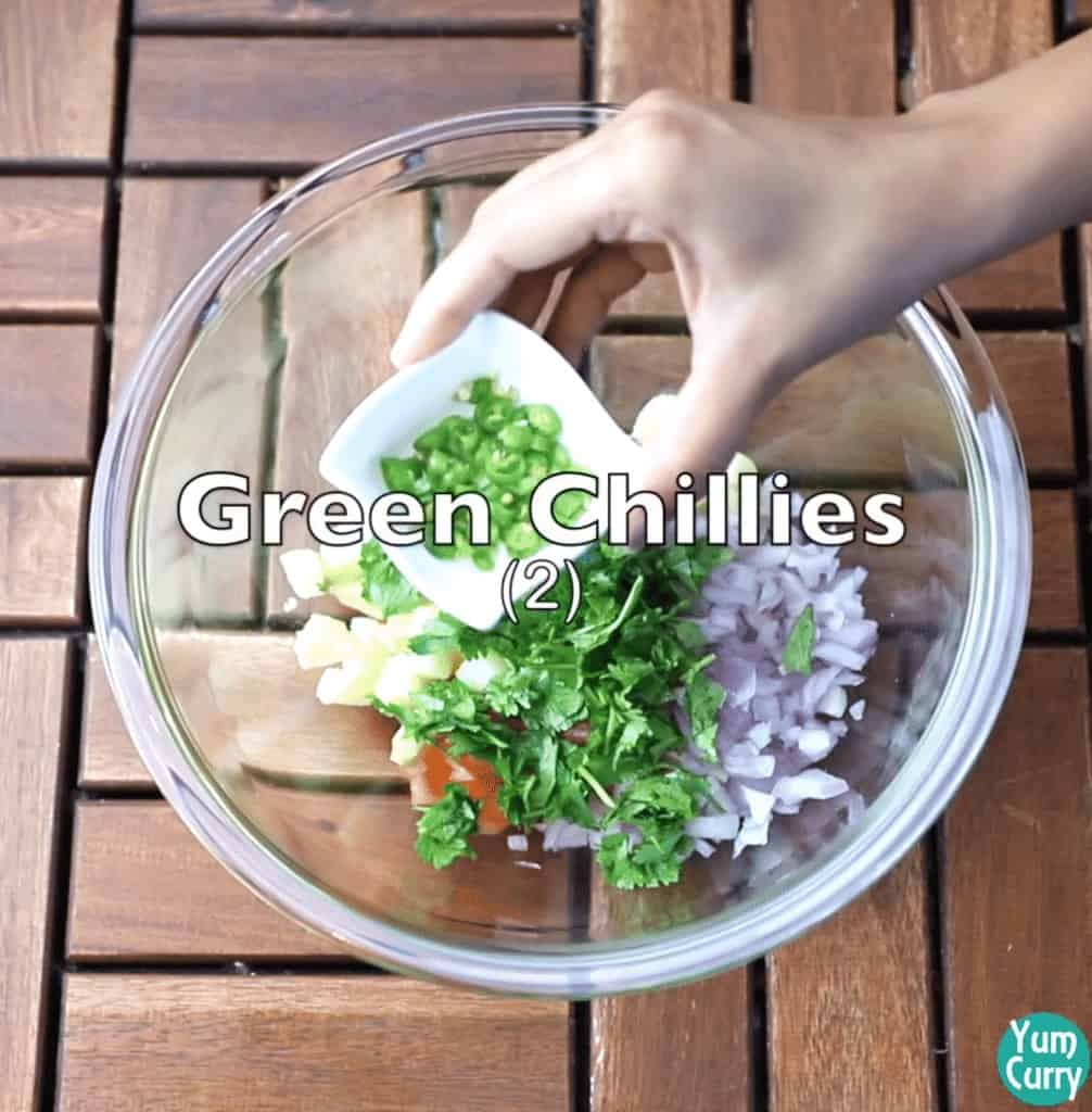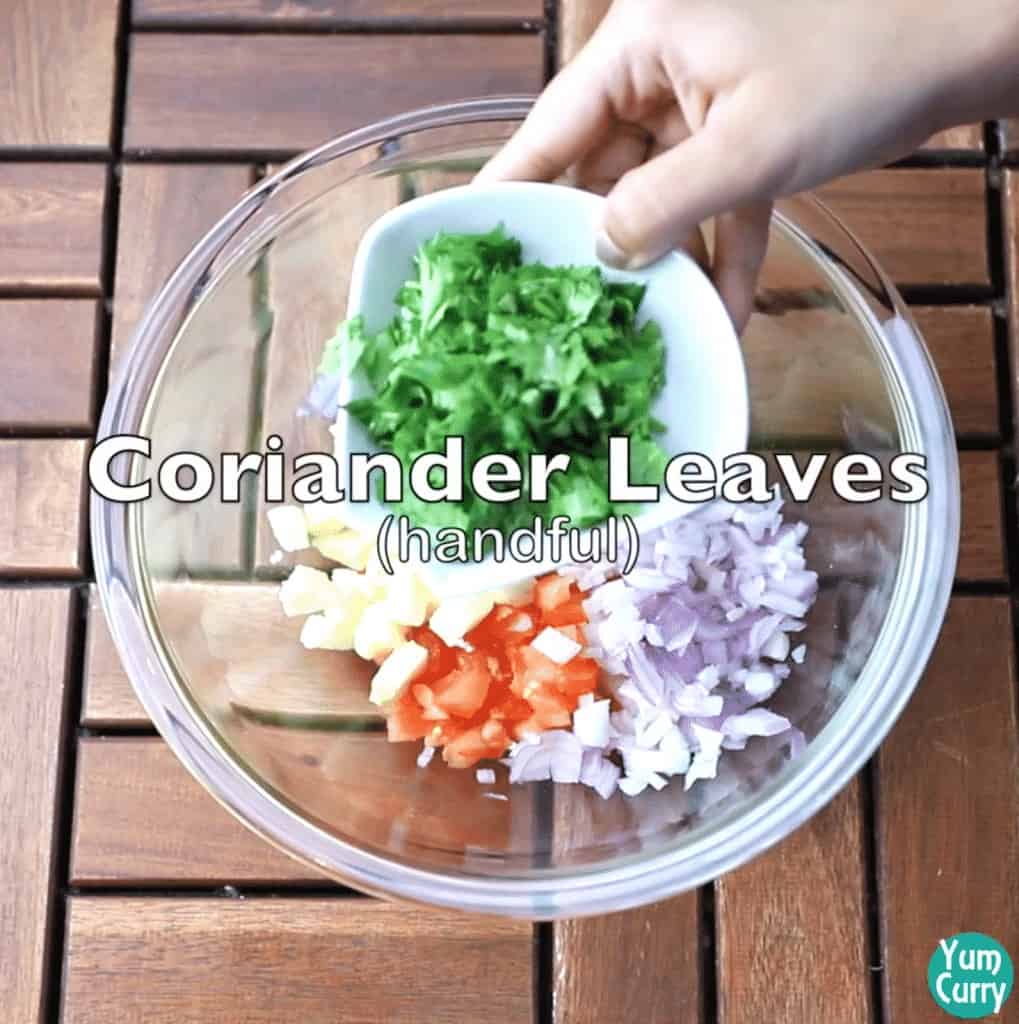 - Add roughly chopped onion, fresh coriander leaves and finely chopped green chilli.