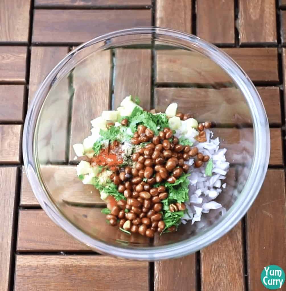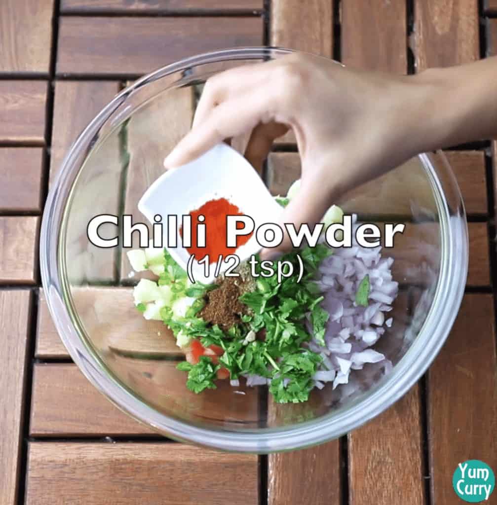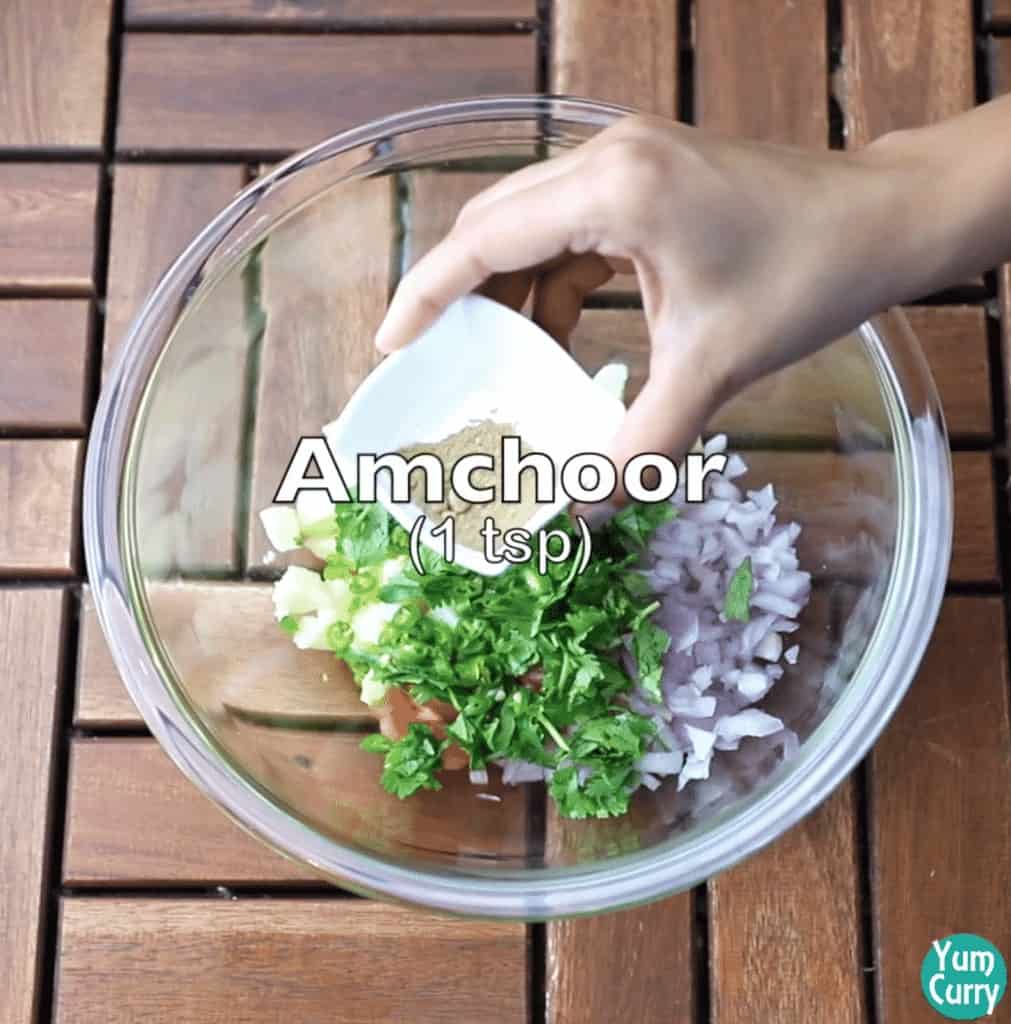 - Add spices, Amchoor powder, cumin powder, red chilli, black salt and salt.