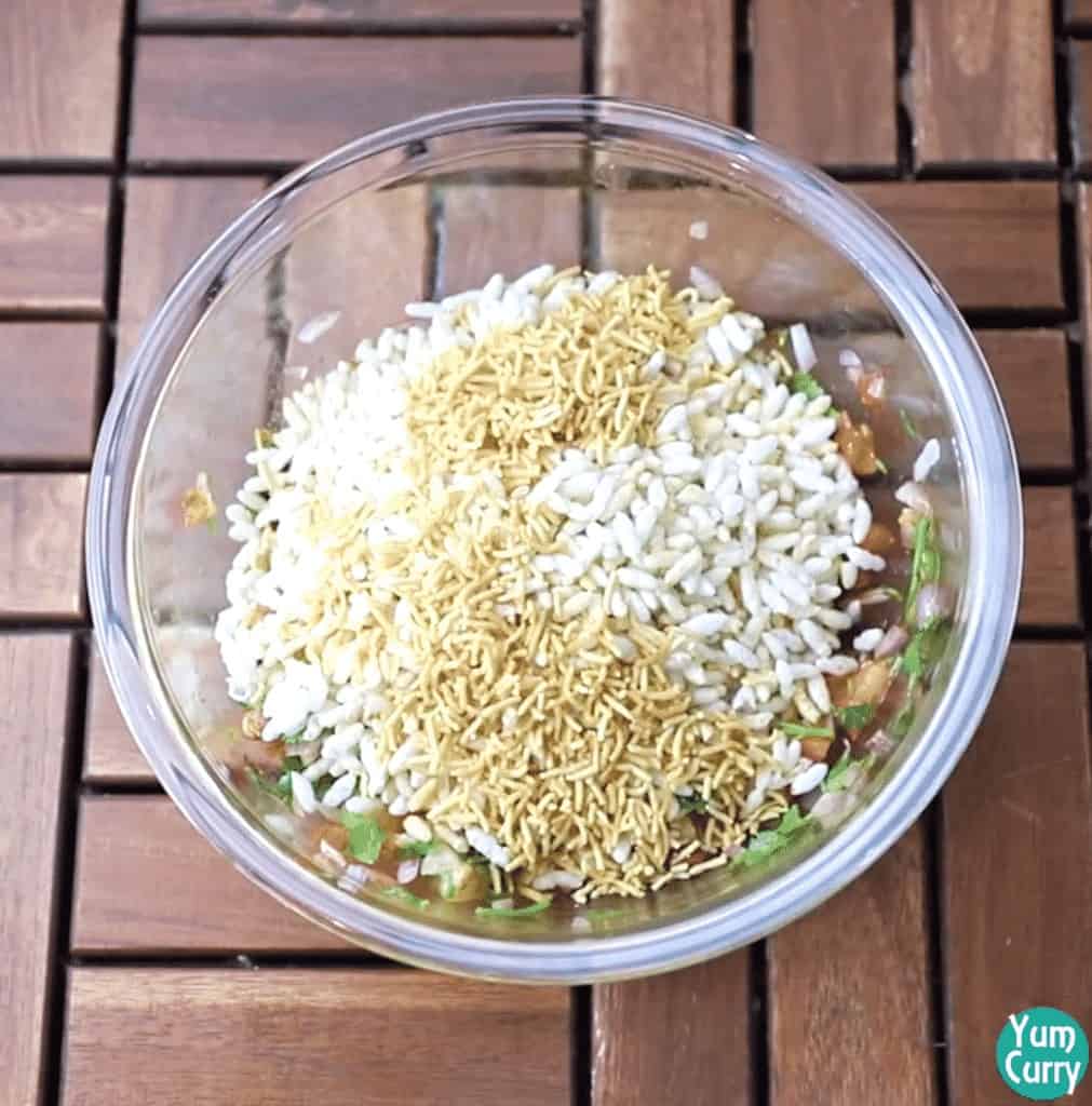 - Add 2 cups of puffed rice and bhujiya sev. Again give it a good mix.