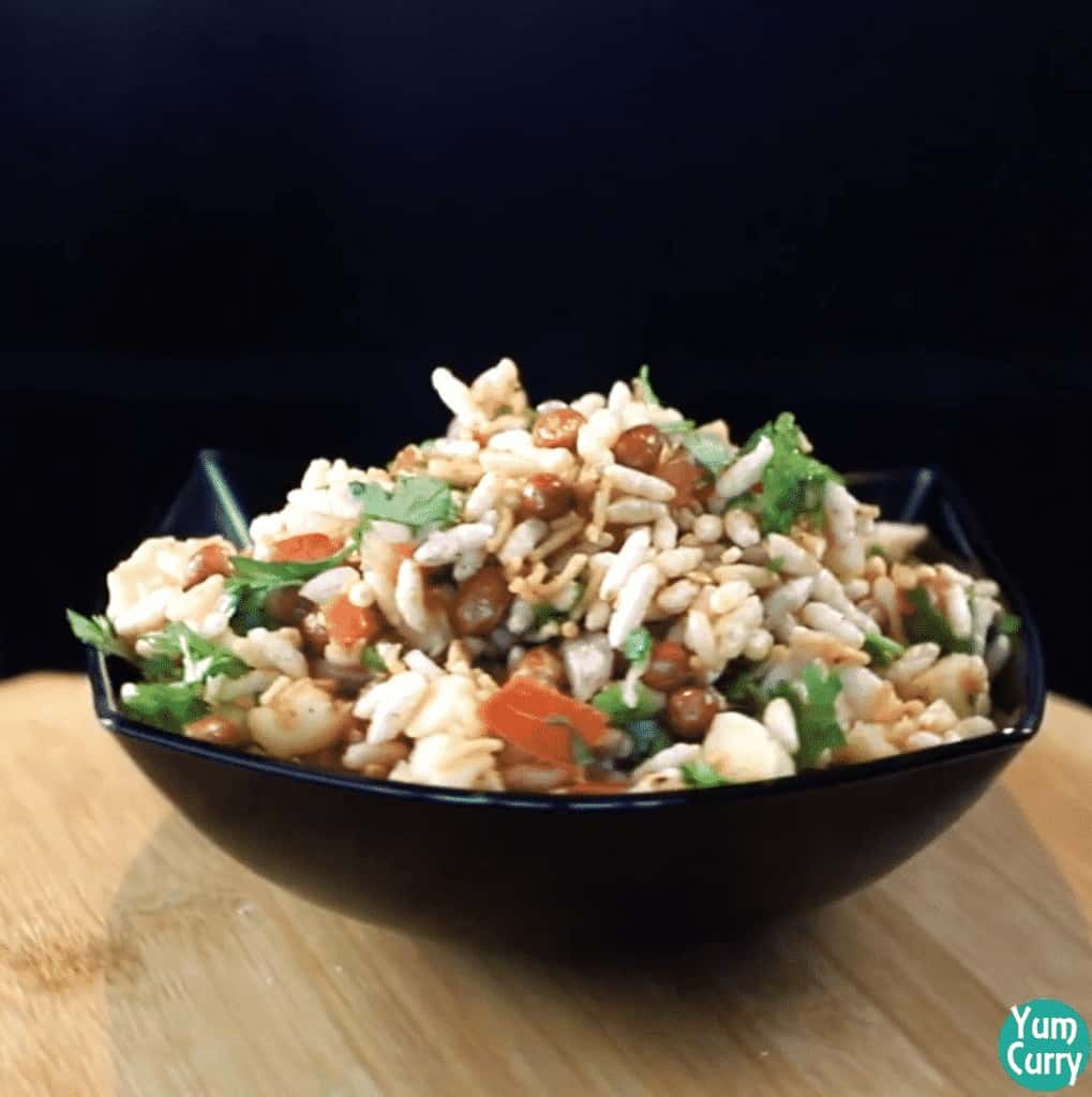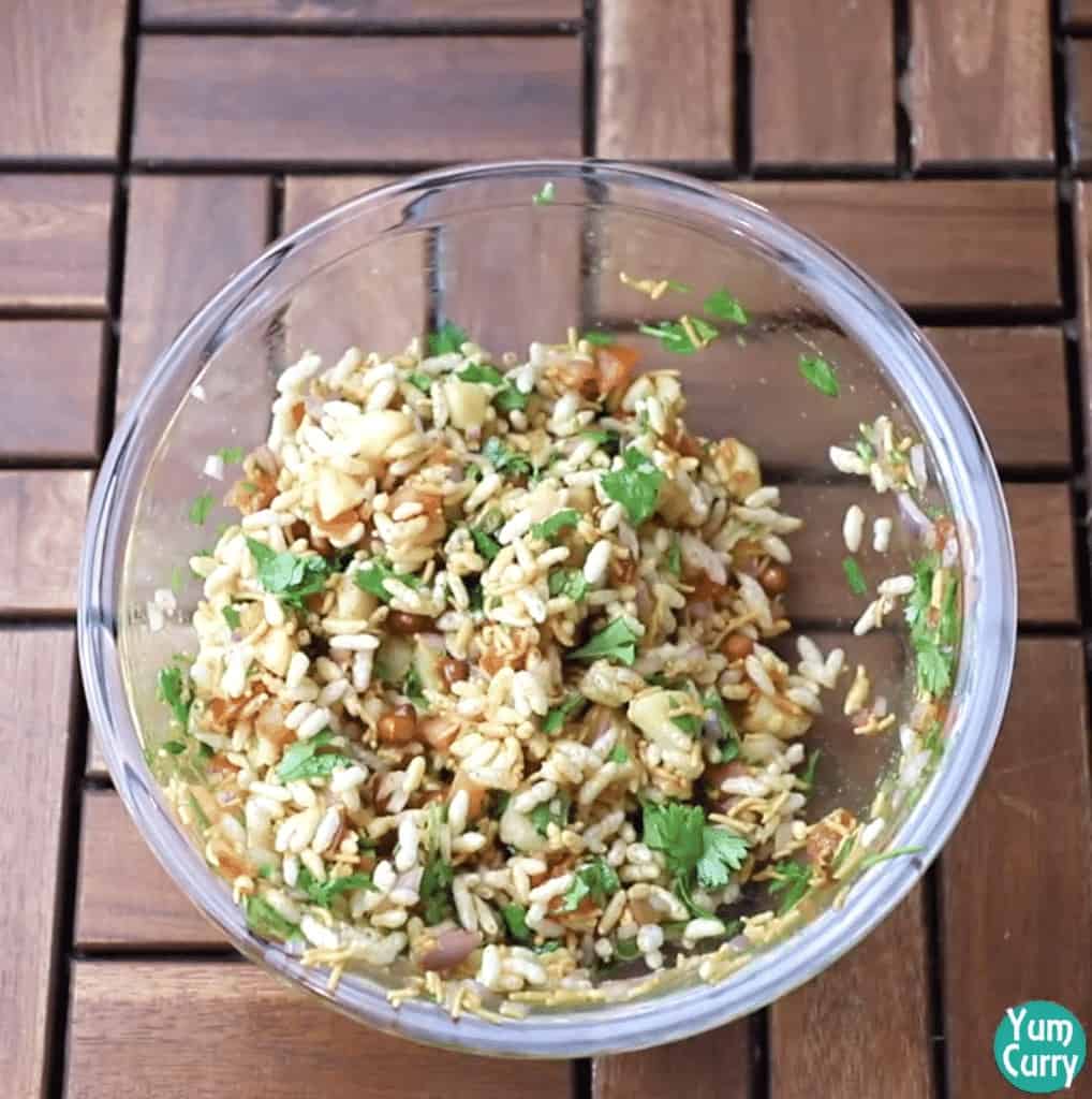 As soon as you mixed all ingredients serve them immediately, because moisture from vegetable turn puff rice and sev to soggy and they don’t taste good without crunchiness.