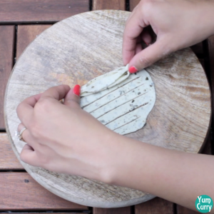 - Make several cuts in the form of parallel lines in the centre. Do not cut all the way through. Now pick up the end and place it on top of the consecutive cuts so that all the cuts overlaps each other. Pinch both ends to seal it.