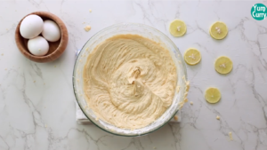 - Take a greased cake pan and transfer the lemon bundt cake batter to the cake pan and spread it evenly.