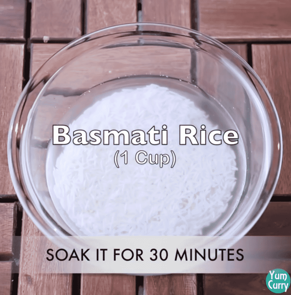 1. Rinse basmati rice until the water becomes clear of the starch and then soak it in enough water for 30 minutes.
