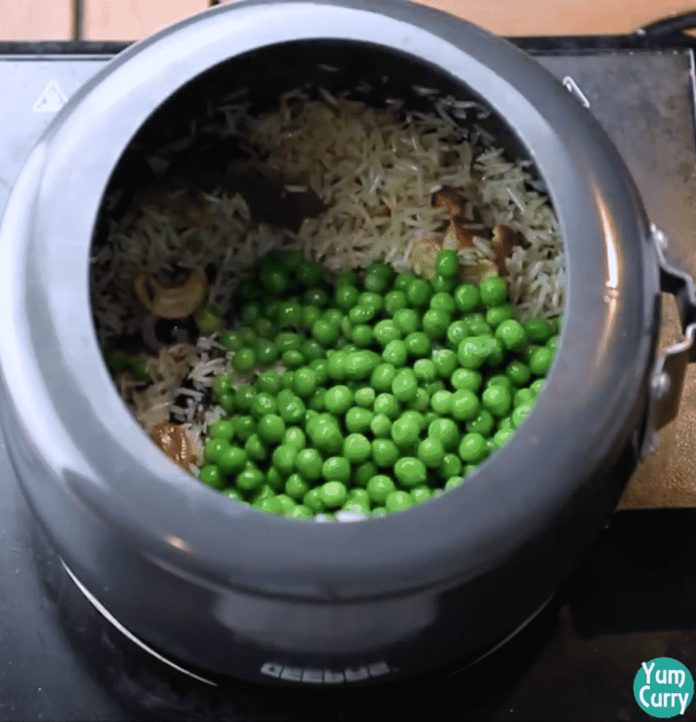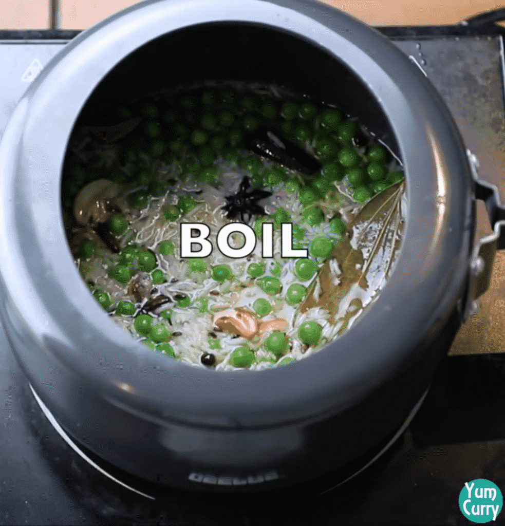 9. Add green peas again give it a mix and add water, bring it to boil.