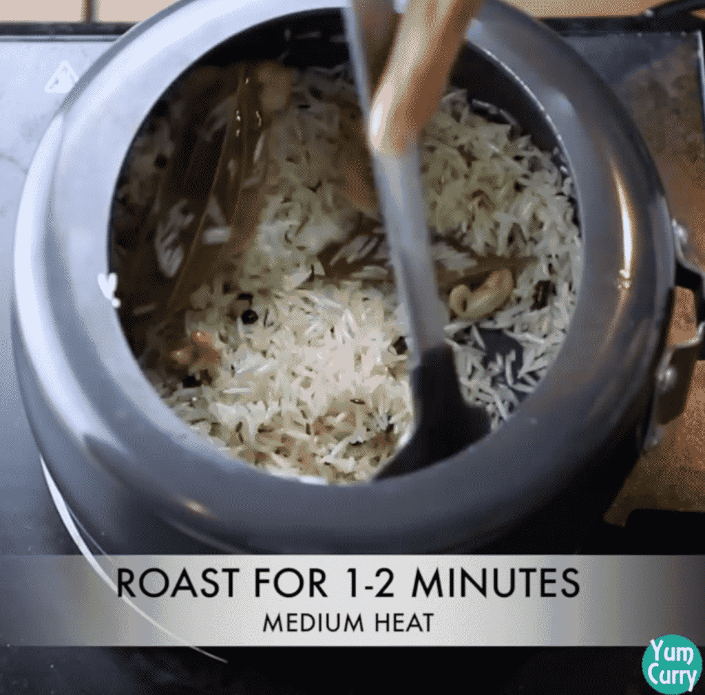 • Saute for 1-2 minutes on medium heat so that rice gets well coated with oil.