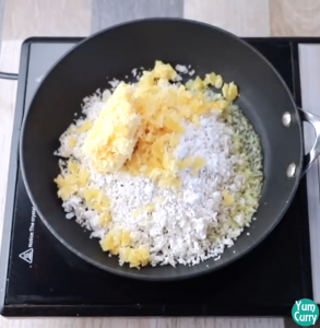 - Add freshly grated coconut and jaggery to the pan.