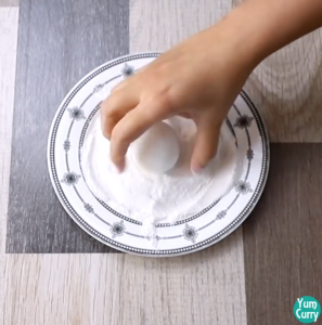 - Roll rice flour mixture ball in to the rice flour. Press with finger and make it flat.