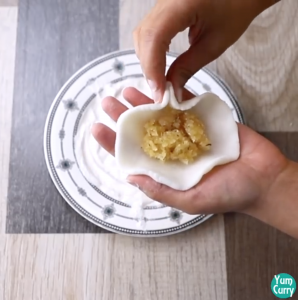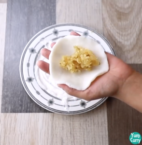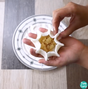 - Take around 1 to 1.5 Tbps coconut and jaggery mixture and keep it in the centre of the rice flour mixture circle.