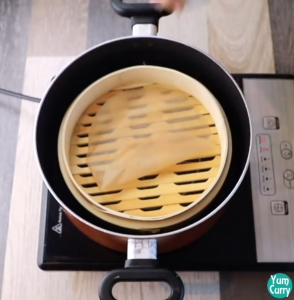 - For steaming, boil 1.5 cup of water in to a deep pan I am using wooden steamer, when water start boil place steamer. Now place modak one by one in to the steamer.