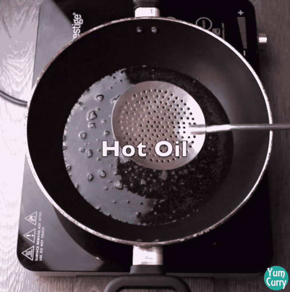 - Heat oil/ghee in a broad pan or kadhai. Hold frying spoon (perforated spoon-one with small holes) right above the kadhai/pan.