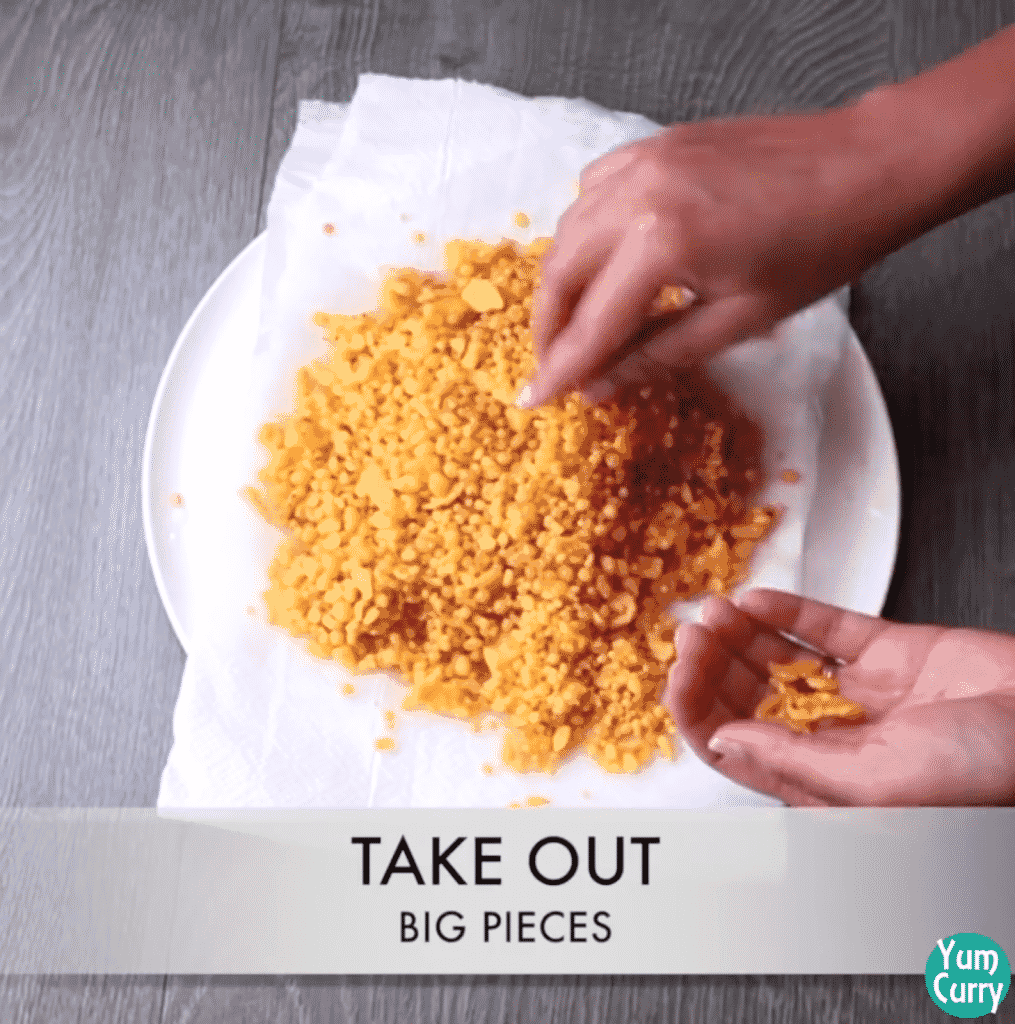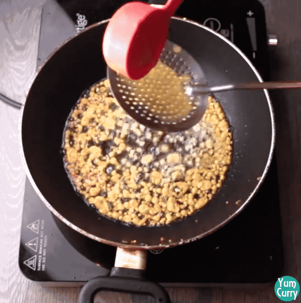 - Once done remove boondi from oil/ghee and place them on a paper towel to soak excess oil. If there are big chunks of boondi you can discard them or crush in to small chunks. Boondi is ready.