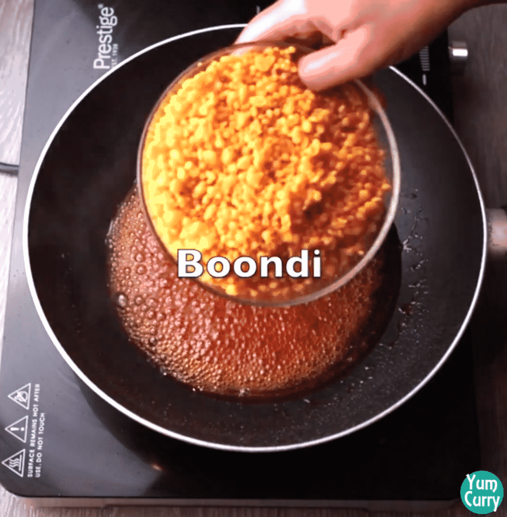 - Mix well. Add cardamom powder and fried boondi to the sugar syrup.