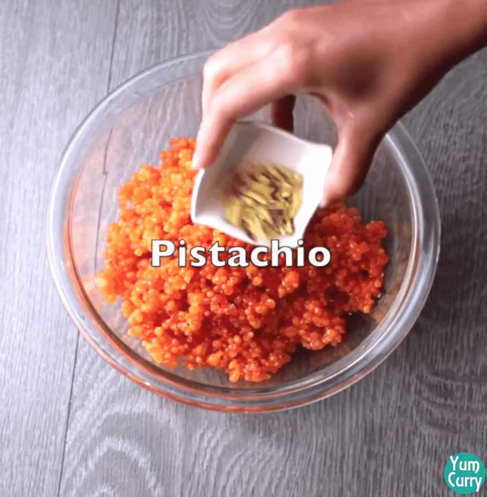 - When mixture cool down and boondi soaked sugar syrup nicely. Transfer the mixture in to a bowl and add chopped pistachio.