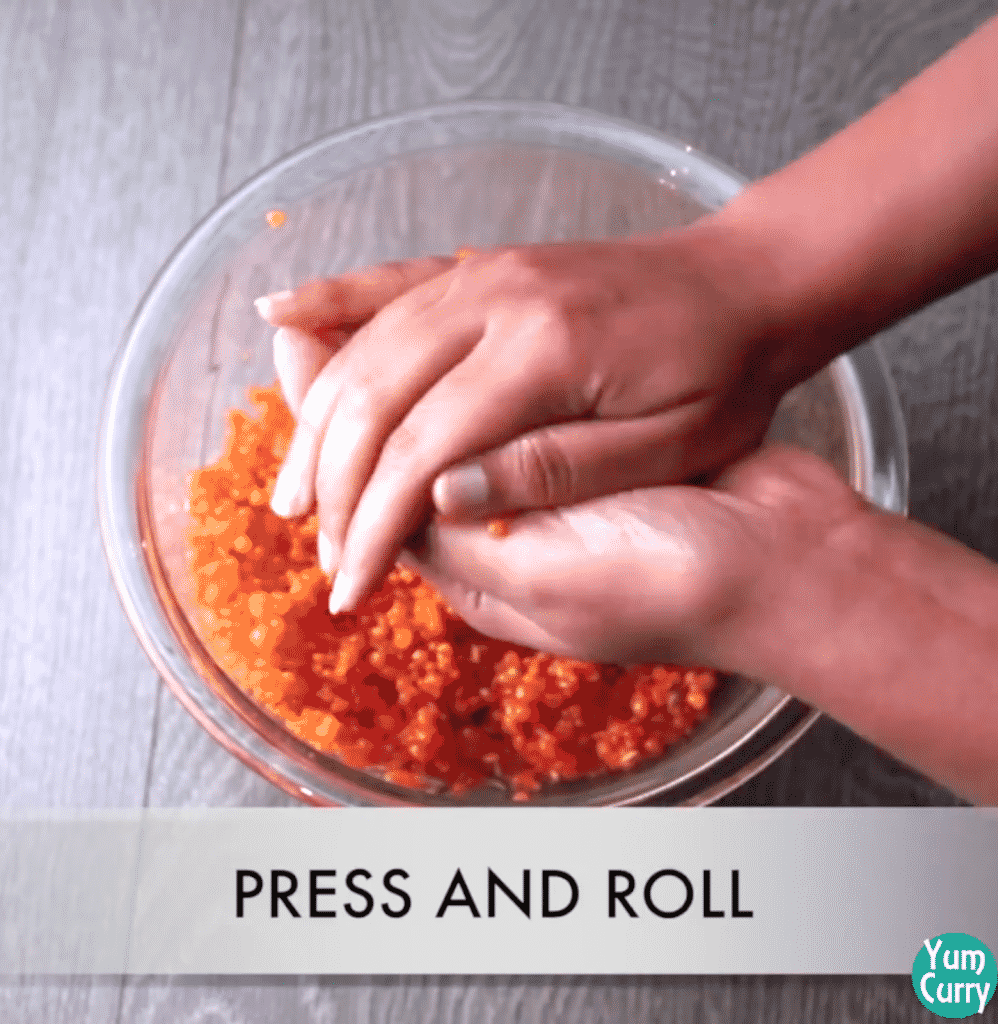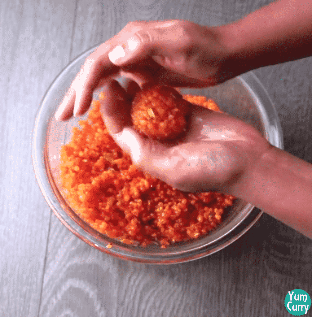 - Take a small portion from the mixture. Press and start shopping laddu. Give it a good round shape.