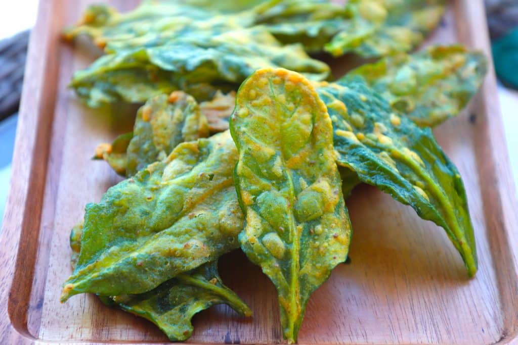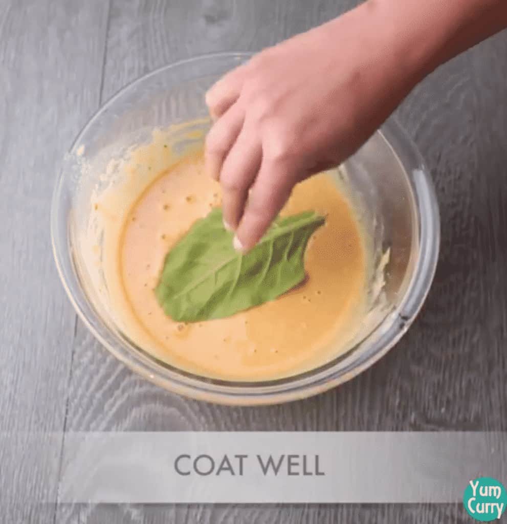 - Dip palak leaf into the gram flour batter, coat it well from both sides.