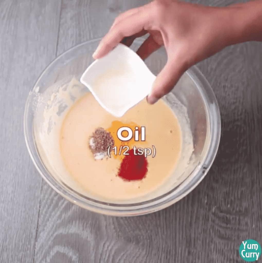 Add spices like turmeric powder, red chilli powder, salt and carom seed. I like to have them with minimal spices but you can also add cumin seeds and fennel seeds. Also add little oil to the batter, it will help to hold/stick batter to the palak leaf. Give it good mix and batter is ready.