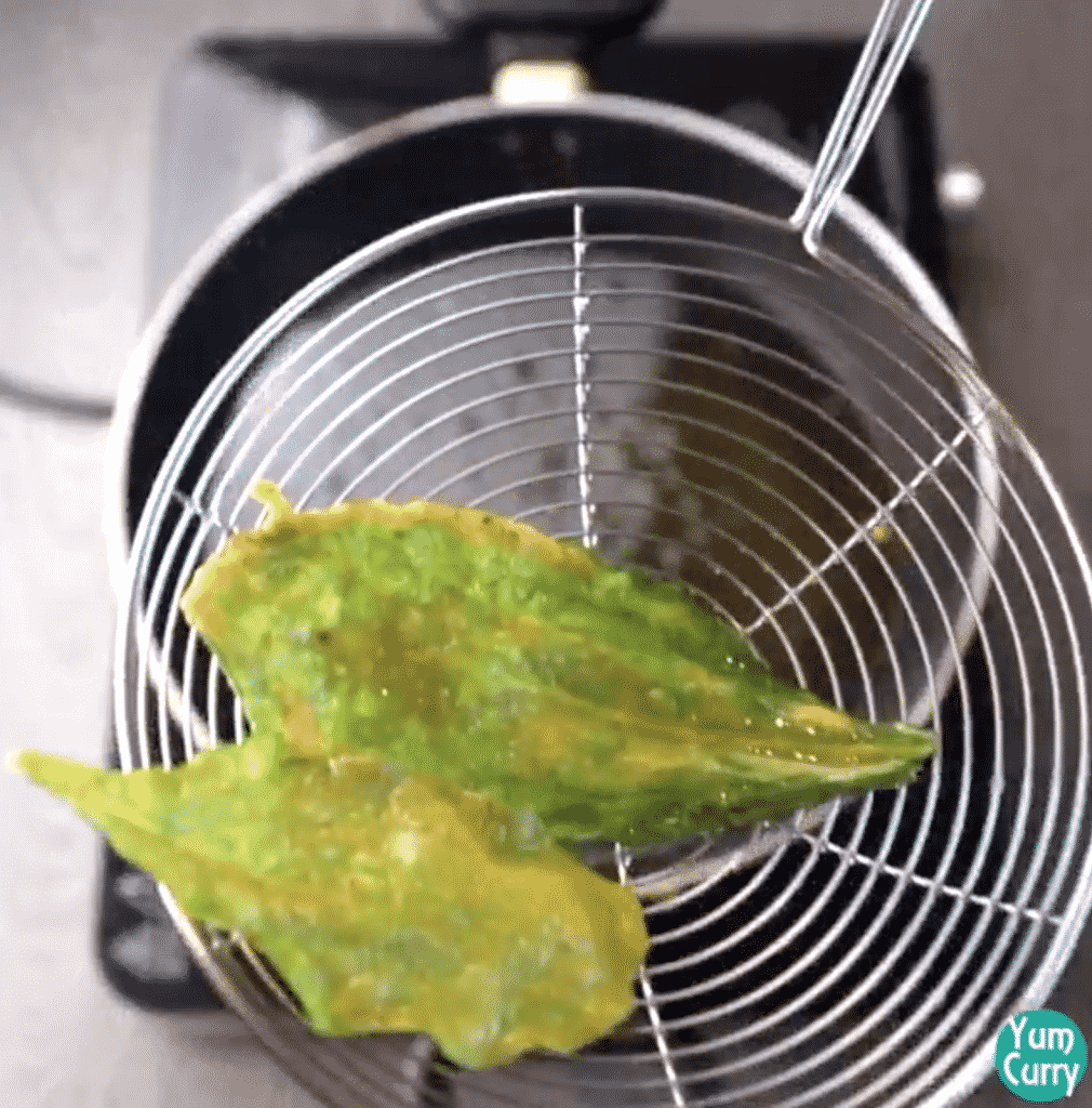 - Slid coated palak leave in to the hot oil and fry it on a low medium heat.
