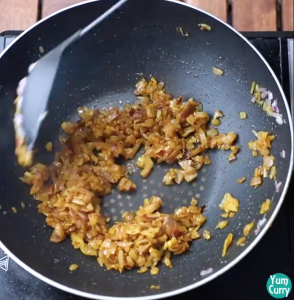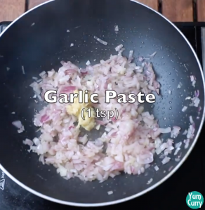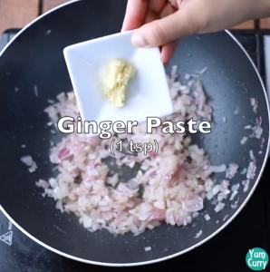 - Add 1 tsp ginger and 1 tsp garlic paste. saute till the raw aroma of ginger garlic paste goes away.
