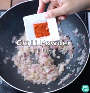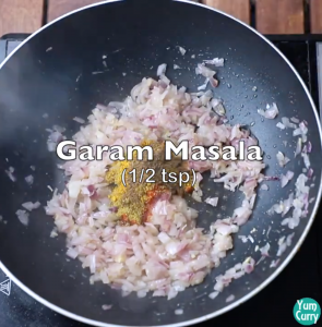 - Now start adding spices, red chilli powder, coriander powder, turmeric powder and garam masala.