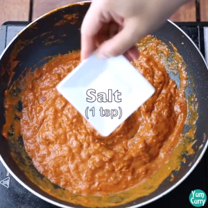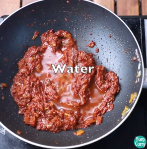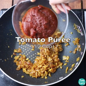 - Add 1/2 cup tomato puree and water to desired consistency. Saute till the mixture become like a paste. Cook for 5 minutes.