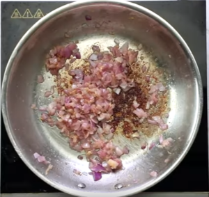 • In the same pan, add another tablespoon of oil. To that, add a cup of onion and fry them till translucent.