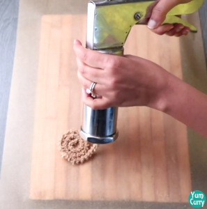 - Roll the dough between you palm and give it to a cylindrical shape, fill this dough in to the murukku maker.
