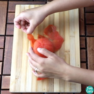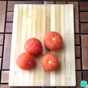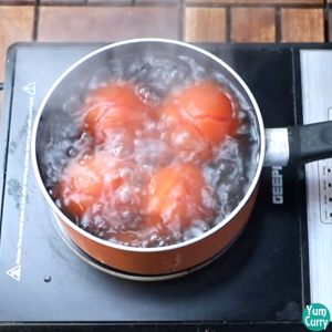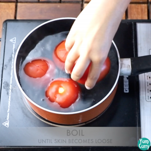 - Boil the tomatoes in water until the skin loosen up (tomatoes should be fully merged into water). This will take approximately 10-15 minutes.