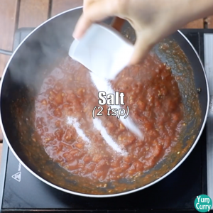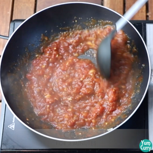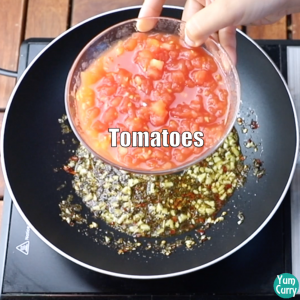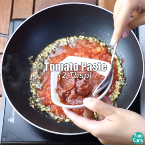- Add prepared tomatoes and tomato puree/paste (store bought tomato puree, this gives really good colour to the pasta) to it. Mix well and cook for 2 minutes on medium-high heat.