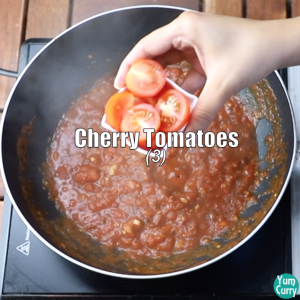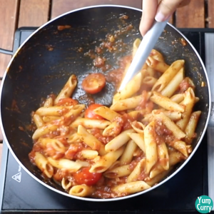 - Now add cherry tomatoes and boiled penne pasta to it. Mix well until combined.